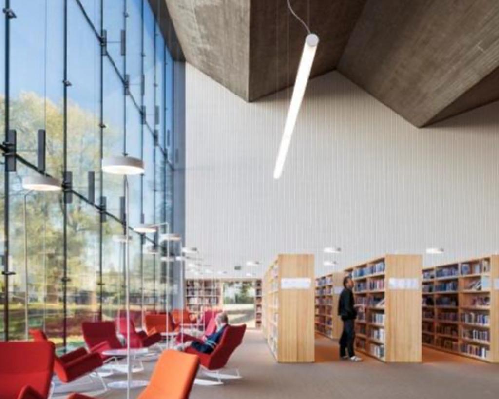 Kirjaston julkisivuun liittyvät lasirakennetyöt 450m². Pilkington Planar pistekiinnitteinen lasijärjestelmä ja muut SG lasitukset.