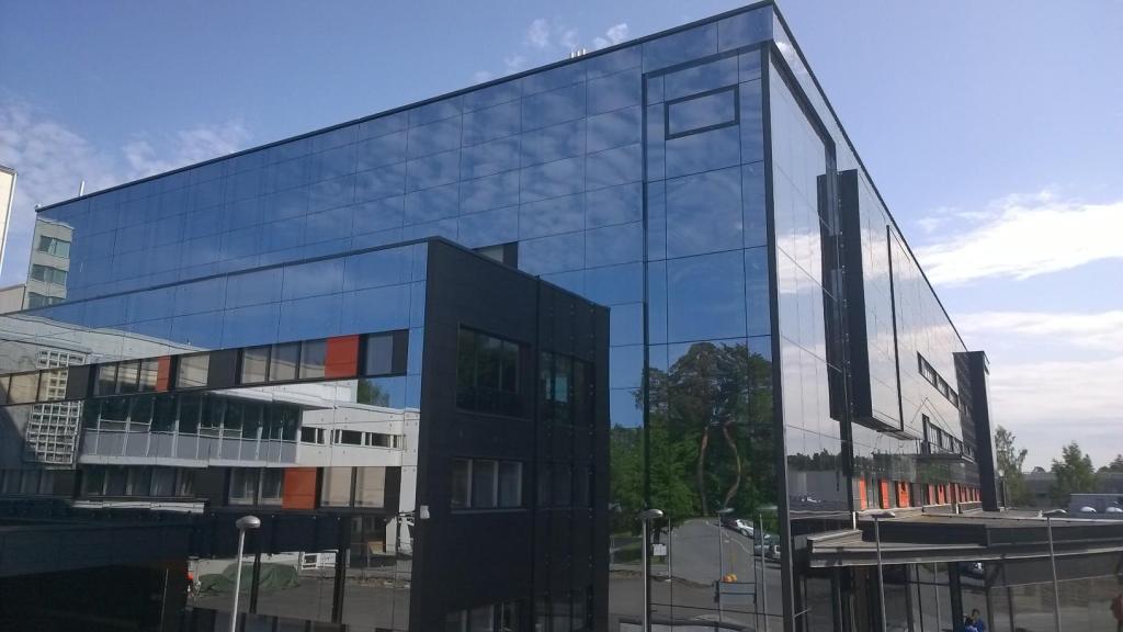 Keskussairaalan laajennus. Y- ja CT -rakennuksien julkisivulasitukset 3200M², kivilevytyöt, metallisäleiköt ja julkisivukasetit.