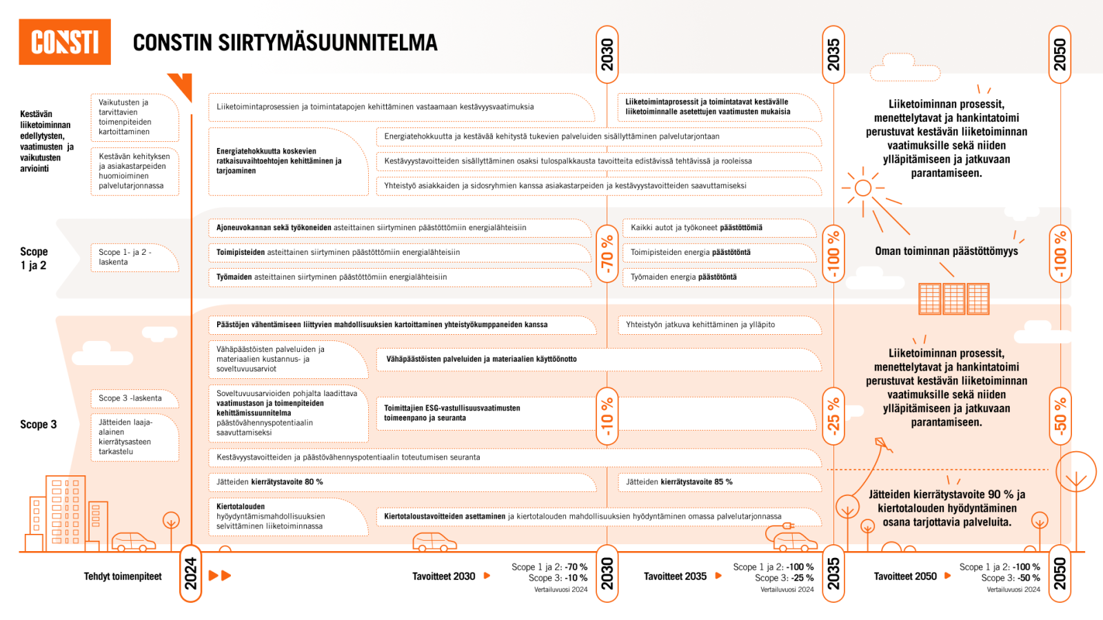 Consti sitoutuu vähentämään päästöjä siirtymäsuunnitelmansa mukaisesti. Tavoitteena on, että oma toiminta on hiilineutraalia vuoteen 2035 mennessä ja että vuoteen 2050 mennessä arvoketjussamme syntyvät päästöt ovat puolittuneet.